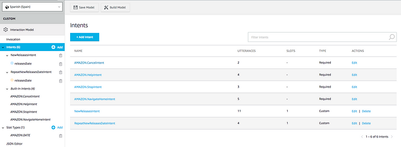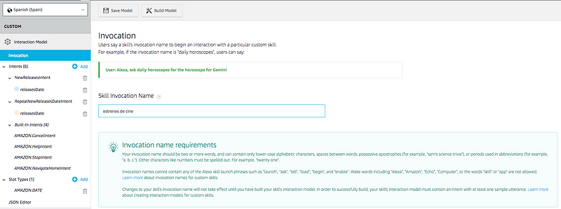 El nombre de invocación será lo que el usuario use para comenzar a interactuar con tu skill y debe cumplir una serie de requisitos. Creo que es bastante importante la elección que se hace porque el usuario podrá invocar el skill y ejecutar un intent de una sola vez, one-shot invocation. Por ejemplo, “Alexa, pide a estrenos de cine las películas de esta semana” y tiene que tener sentido. El usuario también podría conseguir el mismo resultado con: “Alexa, abre estrenos de cine”, el skill puede responder de alguna forma, y luego: “Dime las películas de esta semana”. A mi me gusta bastante la forma de usarlo de one-shot invocation y me he querido centrar en eso al diseñar el modelo.