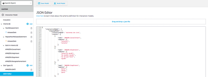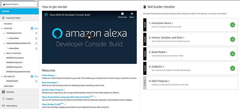 Como comentaba en el anterior post, una vez que tuve la idea sobre qué hacer (un skill para conocer por los estrenos de cine de una fecha determinada) empecé con la parte “cliente” usando la Alexa Developer Console. Por cierto, este site no está traducido al español, no queda otra que usarlo en inglés.