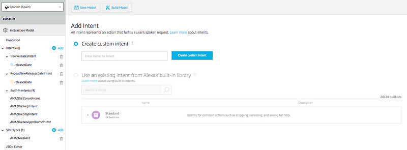 Al crear un intent tienes la opción de usar uno existente de la librería de Alexa, como los built-in intent que eran obligatorios, o uno custom. En mi caso no había uno ya existente que me valiera.