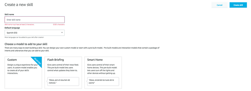 Lo primero que nos pide para crear nuestro skill es: nombre, idioma del skill y de qué tipo es. Puedes consultar los distintos tipos aquí. Los tipos disponibles dependen del idioma por defecto que elijas. El tipo que casaba con mi idea de skill era un “custom skill”.