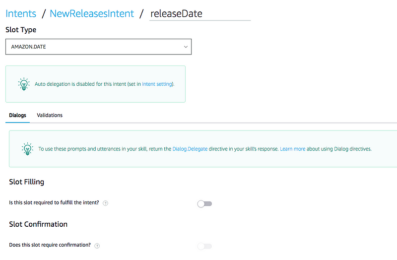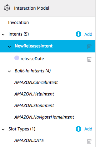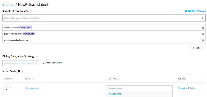 En este caso, ya que vamos a manejar fechas, opté por usar el built-in slot type para fechas: Amazon.DATE. De esta forma, Alexa convertirá la parte del utterance que hemos identificado con el slot en una fecha con formato ISO-8601. Es posible que no siempre sepa pasar lo que detecte a una fecha y, en ese caso, tendremos un bonito null como valor del slot. Tenedlo en cuenta porque habrá que manejarlo en el server. Otra true story 🙂