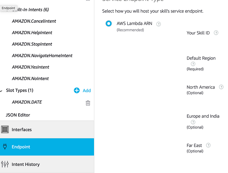 Antes de terminar, es una buena práctica crear varios backend en distintas regiones de AWS si vamos a publicar nuestra skill en varios países. Desde la pantalla de Endpoint vamos a poder indicar la ruta de cada una de las lambdas.