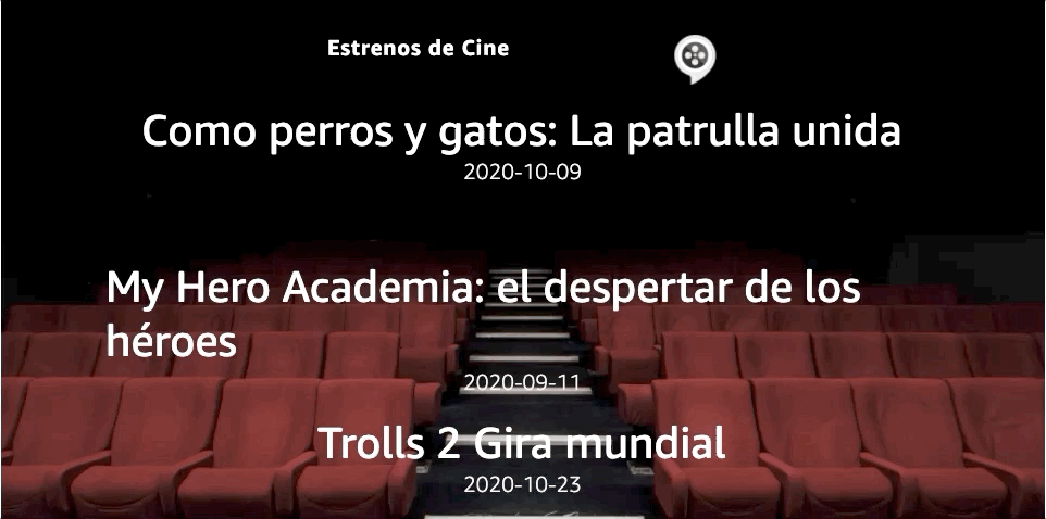 Desde que metí APL a la skill siempre quise añadir el póster a la respuesta por pantalla. En realidad a nivel de arquitectura de información no ha cambiado nada aparte de llegar la imagen. Los otros dos campos por cada película son los mismos de antes: título y fecha de estreno.