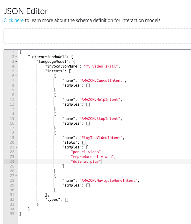 - El modelo de interacción creado ya tiene un Intent custom que se llama HelloWorldIntent. Vamos a sustituir ese Intent por uno propio. Es cierto que para usar esta skill no vamos a necesitar un intent pero es obligatorio tener uno propio. En el editor JSON sustituimos el código de ese intent por: