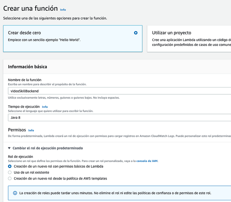 - Creamos una función (ojo con la región, para España la mejor opción actual es la de París). El código de mi proyecto está en Kotlin con lo que seleccionaremos el lenguaje Java 8 (es donde lo tengo ya probado). Vamos a crear también un rol nuevo a no ser que ya tengas uno de antes con permisos correctos para el lambda y los logs de CloudWatch.