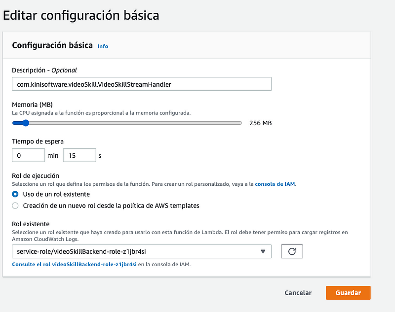 Ahora pasamos a la configuración básica de la lambda (controlador, memoria, etc). Desde la última vez que lo usé he visto un cambio en la interfaz de la consola web de AWS Lambda y han separado en dos partes distintas indicar el controlador de otras opciones como la memoria.