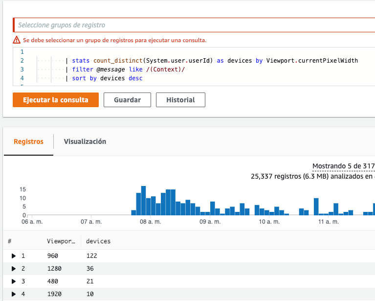 Una vez vayamos teniendo usos de la skill vamos a poder usar esa información del context para identificar, por ejemplo, la resolución soportada por los dispositivos de los usuarios. Esto lo podemos hacer con una consulta en CloudWatch: