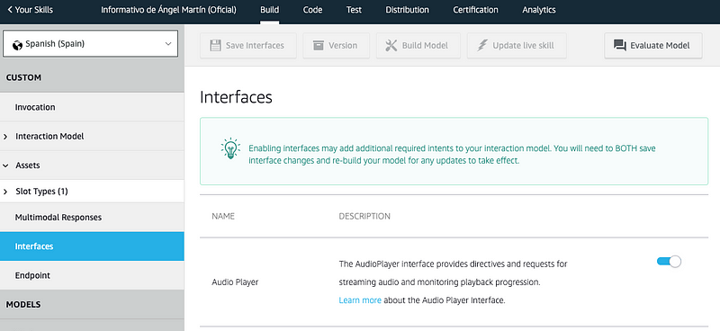 Para que un skill pueda usar la interfaz de AudioPlayer primero tenemos que activarla en el listado de interfaces posibles a implementar. Desde la Alexa Developer Console, dentro de la skill, vamos a Custom > Interfaces.